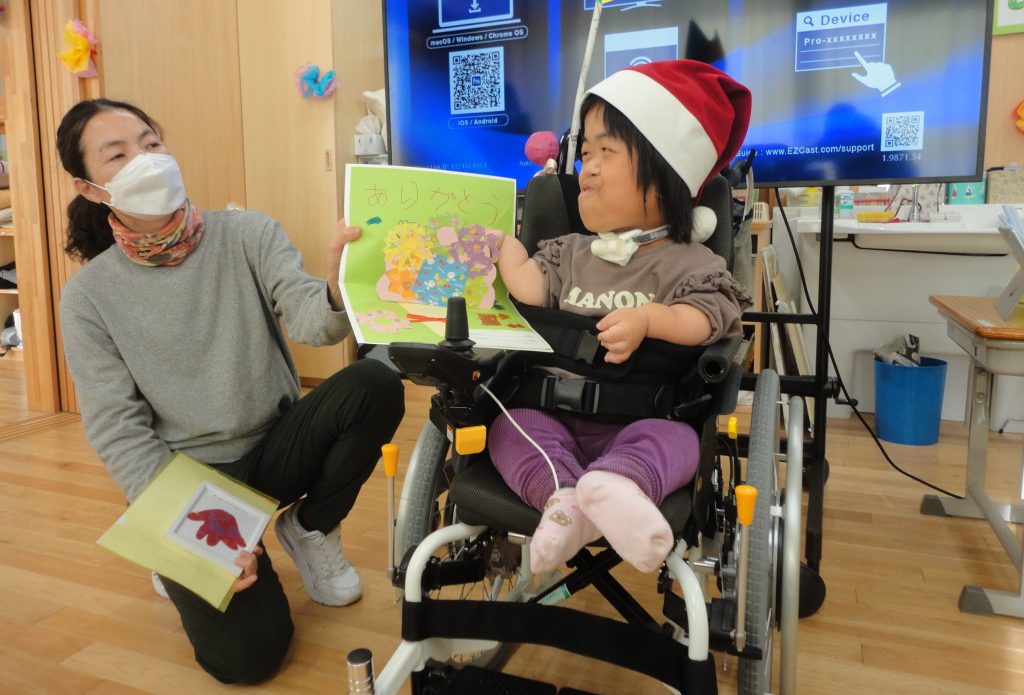 4年生、12月のなかよし学級では、2分の1成人式を行いました。自分たちで作った家族へのメッセージカードや手形アートを発表したり、「集合ゲーム」での仲間を集めたりしながら、親睦を深めました。最後に、サンタさんが遊びに来てくれました。「ジングルベル」の曲に合わせて、楽器を鳴らし、とても盛り上がりました。