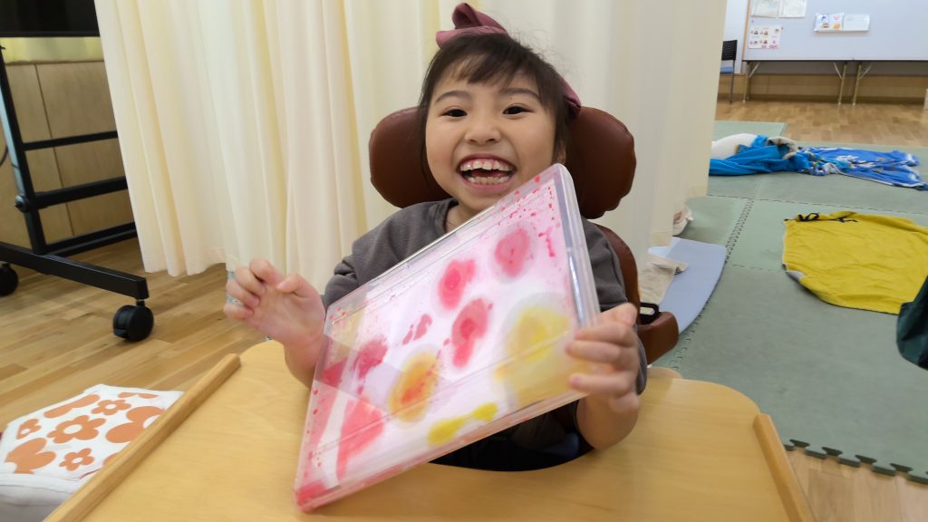 色のついた水を凍らせて、溶かしながら模様をつけました。透明ケースをカタカタ鳴らして中の氷を動かしています。だんだんと色がついていい感じ。うれしくてこの笑顔!満足いく作品を作ることができました。